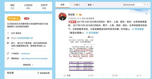 蕭宏慈的微博認證依然為“北京拍拉拍文化傳播有限公司(以下簡稱拍拉拍公司)保健養(yǎng)生顧問、知名健康博主、運動視頻自媒體”,有粉絲17萬多人。
