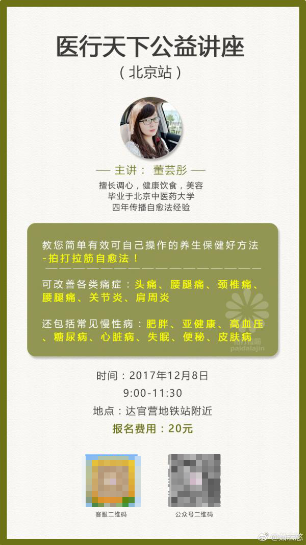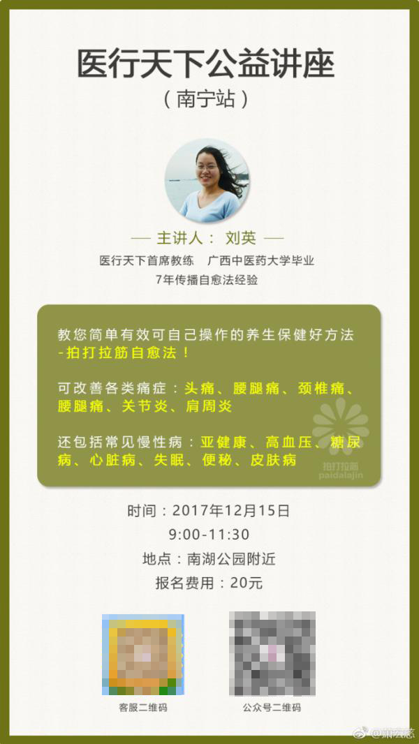 其置頂微博直截了當?shù)貫槭召M的拍打療法體驗營宣傳,內容為2017年12月-2018年2月南寧、上海、深圳、鄭州、北京體驗營的時間安排。