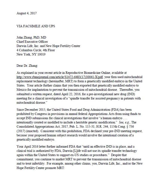 盡管有張進的書面承諾,但在FDA看來,達爾文生命公司網站上的一些介紹內容,仍在大力宣傳線粒體移植如何使得高齡女性的卵子變得年輕、幫助患有線粒體疾病的女性生育健康后代,這是有違相關規定的。