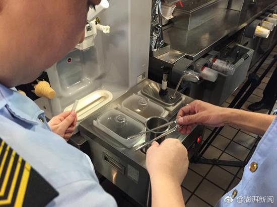 7月27日下午,記者跟隨上海市食藥監(jiān)局執(zhí)法總隊(duì)三支隊(duì),檢查麥當(dāng)勞合川路店。檢測(cè)結(jié)果零細(xì)菌。 澎湃新聞?dòng)浾哙u娟圖餐廳冰淇淋機(jī)器只有一臺(tái),正對(duì)前臺(tái)。執(zhí)法人員首先檢查水果夾清潔程度,結(jié)果顯示,細(xì)菌數(shù)為0,非常干凈。