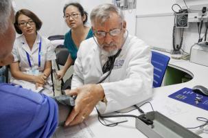 朝陽區衛計委相關負責人表示,培訓項目預計將培養百名家庭醫生團隊優秀師資,建設4個國際家庭醫生團隊培訓基地,提高朝陽區社區衛生服務中心醫護人員的診療水平,助力分級診療建設。圖為高碑店社區衛生服務中心內,美國醫生正在問診中國患者。