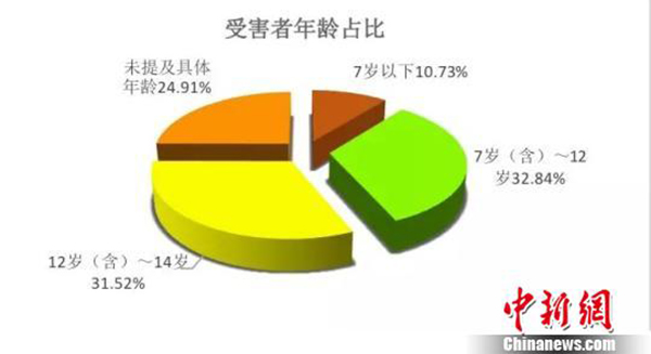 報告顯示,受害者中,年齡最小的僅1歲。7歲以下的65人,占比10.73%;7歲(含)至12歲199人,占比32.84%;12歲(含)至14歲191人,31.52%;另有151名14歲以下兒童未提及具體年齡。這顯示7至14歲孩子更容易成為犯罪嫌疑人侵害的目標。同時,在一定程度上說明中國義務教育階段對于兒童自我保護及防范性侵相關教育缺失,并且隨著孩子年齡的增長,也沒有得到知識的及時補充和能力提升。