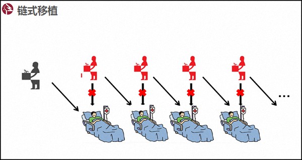 第二種方式是鏈式匹配。簡單的說就是將死者捐獻的器官移植給某個病人,但前提條件是病人的親屬答應把腎捐給下一個病人,這個病人的親屬又答應把腎捐給下一個,形成鏈式反應。鏈式移植的最大好處是并不需要嚴格同時執行,每一個家庭都是病人先得到腎再由捐贈人捐獻器官。如果有人反悔,雖然會有一些負面的影響,但是相對來說影響會小很多。鏈式移植的另一個好處是可選擇性高,相對來說,會大大提高系統的移植效率。不過,缺點是會消耗一部分死者捐獻的腎源。