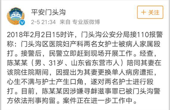 記者了解到,門頭溝公安分局已就此事進行通報,2018年2月2日15時許,門頭溝公安分局接110報警稱:門頭溝區(qū)醫(yī)院婦產(chǎn)科兩名女護士被病人家屬毆打。接警后,民警立即趕到現(xiàn)場開展工作。經(jīng)查,陳某某(男,31歲,山東省東營市人)陪同其妻在該院住院期間,因提出為其妻更換單人病房遭拒,心生不滿與護士產(chǎn)生口角,遂對兩名護士進行毆打。目前,陳某某因涉嫌尋釁滋事罪已被門頭溝警方依法刑事拘留。案件正在進一步工作中。