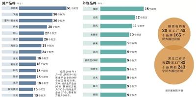 在地域分布上,陜西和黑龍江無論在生產(chǎn)企業(yè)和配方注冊數(shù)量上均領(lǐng)先于其他地區(qū)。據(jù)新京報記者不完全統(tǒng)計,陜西省約有20家工廠55個品牌165個配方通過注冊。而在黑龍江地區(qū),約有29家工廠82個品牌的243個配方通過注冊。