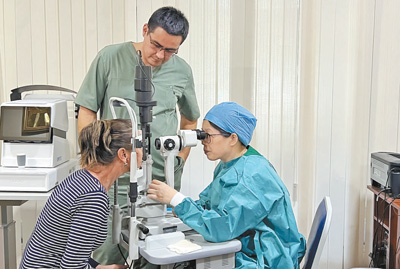 中方醫生(右一)正在為烏茲別克斯坦患者做眼科檢查。