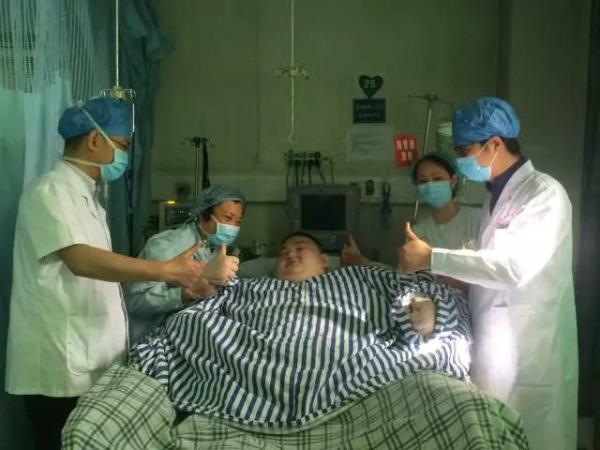 醫(yī)院為他定做了病床、病員服、腰圍尺,手術(shù)床,轉(zhuǎn)運(yùn)車,手術(shù)器械。按照營養(yǎng)科的醫(yī)生給他配制的營養(yǎng)餐和康復(fù)科醫(yī)生的訓(xùn)練,兩個(gè)多月后,他的體重降到438斤。減重將近100斤后,黃佳鑫走路和呼吸都輕松了些。