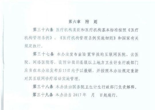 其中《辦法》一共有三十九條,分為“總則”、“互聯(lián)網(wǎng)治療活動準入”、“互聯(lián)網(wǎng)診療活動執(zhí)業(yè)規(guī)則”、“互聯(lián)網(wǎng)診療活動監(jiān)督管理”、“法律責任”和“附則”共六章。