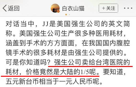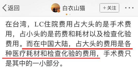 業(yè)內(nèi)人士@白衣山貓發(fā)文稱,他從臺(tái)灣業(yè)內(nèi)人士處得到的信息是,中國(guó)大陸的醫(yī)療耗材費(fèi)用所占比例遠(yuǎn)高于臺(tái)灣。