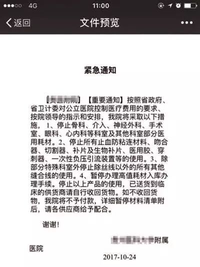 事情的起因是前幾天,落款為貴州省某三甲醫(yī)院的緊急通知被廣泛傳播。從內(nèi)容中可以看出,醫(yī)院將采取停止多個(gè)科室部分醫(yī)用耗材的措施,還將暫停辦理高值耗材入庫(kù)手續(xù)。已經(jīng)送貨到臨床的供貨商被要求自行收回貨物。