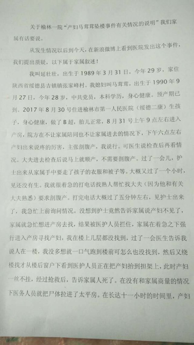 據媒體報道,榆林市第一醫院發表聲明稱是因為家屬多次拒絕實施剖腹產,最終導致產婦難忍疼痛、情緒失控跳樓。孕婦的丈夫延先生則否認了院方的說法,稱家屬曾先后兩次同意實施剖腹產,但醫院回說" 快要生了,不用剖腹產。"