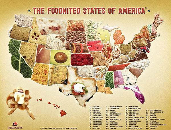 據英國《每日郵報》7月20日報道,美食網站Foodiggity創始人克里斯?杜爾索(Chris Durso)和他的兒子卡梅隆?杜爾索(Cameron Durso)共同用食物為美國50個大州制作了系列美食地圖,并采取雙關語為之命名,其奇思妙想令人稱奇。,