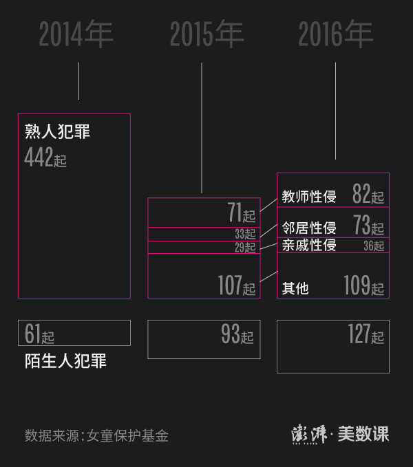 近幾年,未成年人保護(hù)議題受到了公眾越來越多的關(guān)注。據(jù)女童保護(hù)基金的統(tǒng)計,媒體報道的性侵兒童(14歲以下男童女童)案件從2013年的125起上升到2016年的433起(受害人約778人)。現(xiàn)實生活中,案件數(shù)量遠(yuǎn)高于媒體曝光起數(shù):據(jù)最高人民法院6月1日新聞發(fā)布會,從2013年到2016年,僅猥褻兒童犯罪案件就已審結(jié)10782件。最高法正調(diào)研猥褻兒童情節(jié)惡劣的認(rèn)定標(biāo)準(zhǔn)。