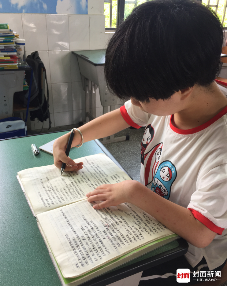 陳古路在寫作業。 今年18歲的陳古璐,是都江堰玉壘中學的畢業生。因為患有先天性的上肢肌肉萎縮,雙手比其他人短小很多,寫字時只能用大拇指和食指夾著筆,筆尾靠著手腕,通過手腕的擺動來完成書寫。 在剛剛結束