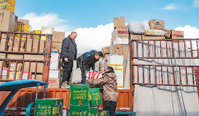 那曲市申扎縣地處西藏北部高原腹地,為了讓群眾在家門口吃上新鮮、平價的果蔬,西藏自治區商務廳近年來以申扎縣供銷合作社為實施主體,改造了16處縣、鄉鎮、村級果蔬配送直銷點。目前申扎縣共設立44處果蔬配送直銷點,行政村覆蓋率達69%。圖為申扎縣供銷合作社員工在拉薩為偏遠鄉鎮果蔬配送試點項目的貨車上貨。