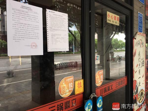 25日上午,南都記者來(lái)到位于黃埔區(qū)豐樂(lè)北路附川鍋火鍋店,該門店已停止?fàn)I業(yè)。玻璃門上了鎖鏈,透過(guò)玻璃窗可見店內(nèi)仍有餐桌椅和散落的廚具,行政處罰事先告知書就張貼在門口,旁邊還有電費(fèi)欠費(fèi)通知單,一旁酸菜魚店服務(wù)員介紹該火鍋店才開了半年,已經(jīng)關(guān)門一個(gè)月了。