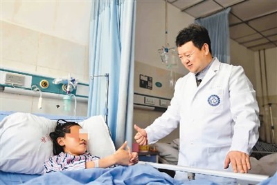 圖為2020年1月16日,在四川省甘孜藏族自治州人民醫院,王文濤(右)在病房里鼓勵一名包蟲病患者。