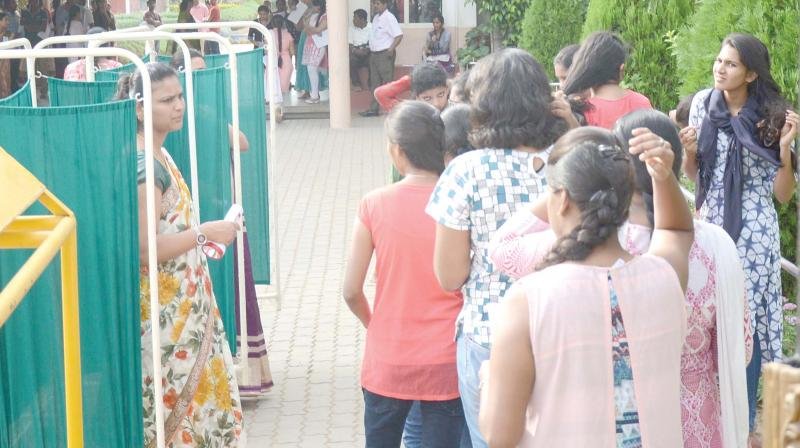 原以為已經(jīng)沒問題的魯帕在接受金屬檢測器檢查時(shí)又聽到了“嗶嗶”聲。安檢人員說魯帕的文胸帶有鋼圈,所以不能進(jìn)入考場。他們不允許魯帕到衛(wèi)生間去更衣,魯帕只能當(dāng)著眾多考生的面脫下自己的文胸。“那真的是非常羞辱。”魯帕回憶道。圖為學(xué)生們在考試之前接受檢查。