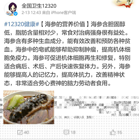 有意思的是,@全國衛生12320不僅懟過阿膠,還捧過海參和干貝。官微曾盛贊干貝是“女性減肥修身之佳品”,“有助于降血壓、降膽固醇”,“還具有抗癌、軟化血管、防止動脈硬化等功效”。對于海參,@全國衛生12320的官微也不吝表揚,“海參中的皂甙能夠幫助抑制腫瘤,提高機體細胞免疫力”。