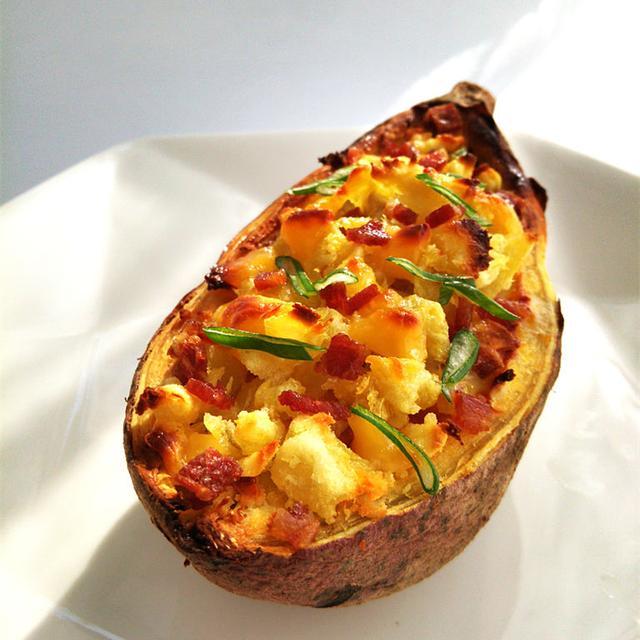 烤紅薯恐怕沒人不愛吃吧?香甜軟糯又熱乎,冬天吃上一個(gè),渾身都是暖的。但是直接把整個(gè)紅薯放進(jìn)烤箱烤的話,耗時(shí)太久了,至少需要個(gè)把小時(shí)吧。這時(shí)就有一個(gè)小竅門了,可以在三五分鐘內(nèi),就讓紅薯烤到八成熟,再加上雞蛋、奶酪、培根和香蔥,不但營(yíng)養(yǎng)豐富,而且口感和口味多樣,還很有新意,沒有烤箱的話,用微波爐就可以完成,想不想試一下?