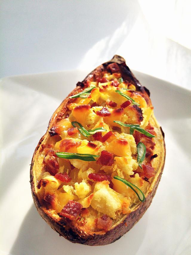 完成后把紅薯取出,看看雞蛋是不是基本凝固了,輕輕按一下蛋黃表面,有微微流動(dòng)的感覺,這樣的程度正好。這時(shí)候不要烤到全熟,不然之后會(huì)太干了。將剛才挖出來裝在盤里的紅薯肉,重新放回紅薯上,把剩的培根和奶酪丁灑在上面,頂部刷少許融化的黃油或植物油,再放入烤箱中上層,單開上火180度,烤3分鐘左右,將頂部的培根烤熟,奶酪烤化就行了。