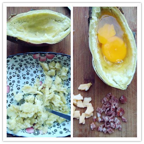 用勺子把紅薯中間的肉挖出一個(gè)坑,注意不要挖得太深,弄破表皮。把挖出的紅薯肉放在另一個(gè)盤中備用。把一個(gè)雞蛋打進(jìn)紅薯里,用牙簽扎破蛋黃表面的膜,讓蛋黃流出來,這樣烤的時(shí)候就不會(huì)爆了。另外將培根和少許早餐奶酪切小丁備用。培根也可以用香腸代替。