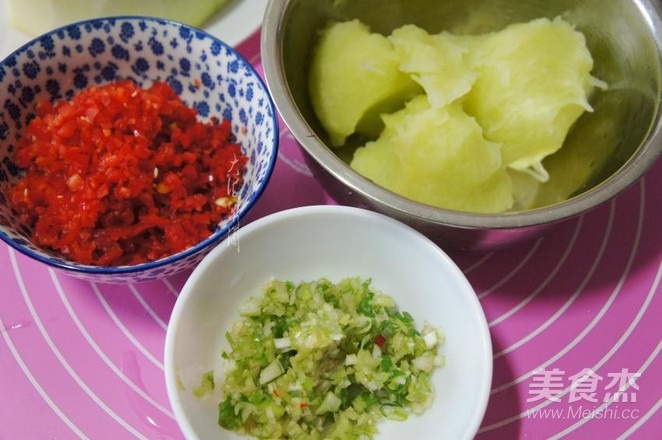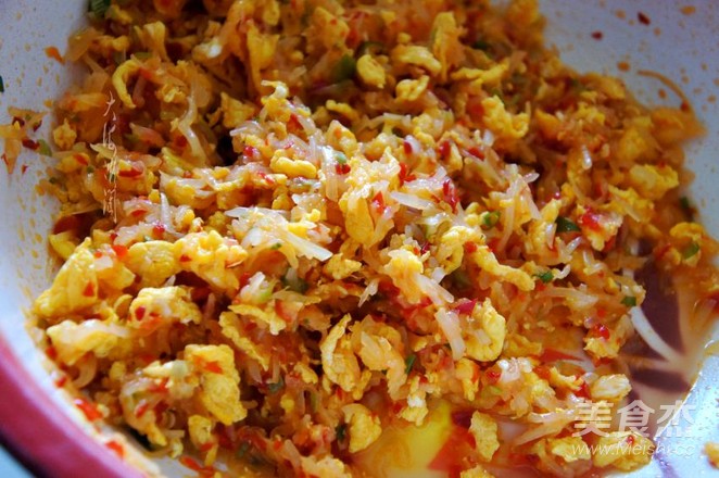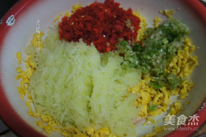 吊瓜去皮洗凈,擦絲,撒鹽拌勻5分鐘后攥掉水分,紅椒洗凈切碎,蔥姜切碎