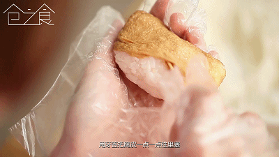 再捏一個與腐皮長度相等的橢圓形飯團,捏緊后放入腐皮中。