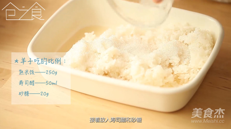 放入壽司醋和砂糖。酸甜度每個人可以根據口味調節的,充分攪拌均勻后放在一邊入味。(下面是我自己吃的比例)