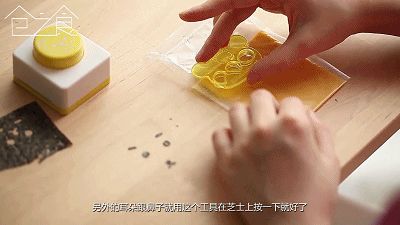 把紫菜對準放入后,用力按下去,輕松熊的眼睛嘴巴就出來了。