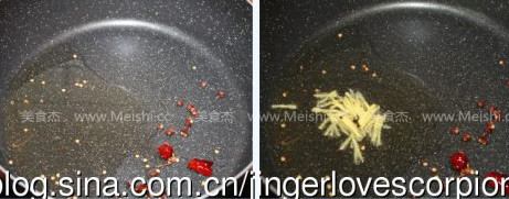 2.鍋里放油后,油五六成熱的時候放入花椒和干辣椒炒香,待油完全熱了以后放入生姜