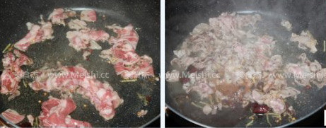 3.生姜炒出香味后倒入羊肉片翻炒,等羊肉變色后,倒入少許生抽