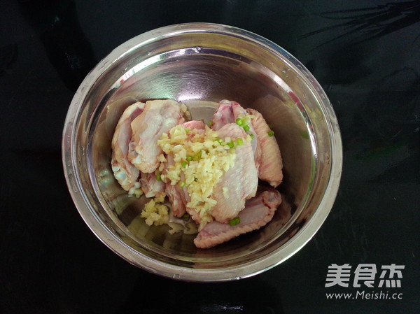 4.將雞翅中放盤內,再加入姜、蒜和小蔥