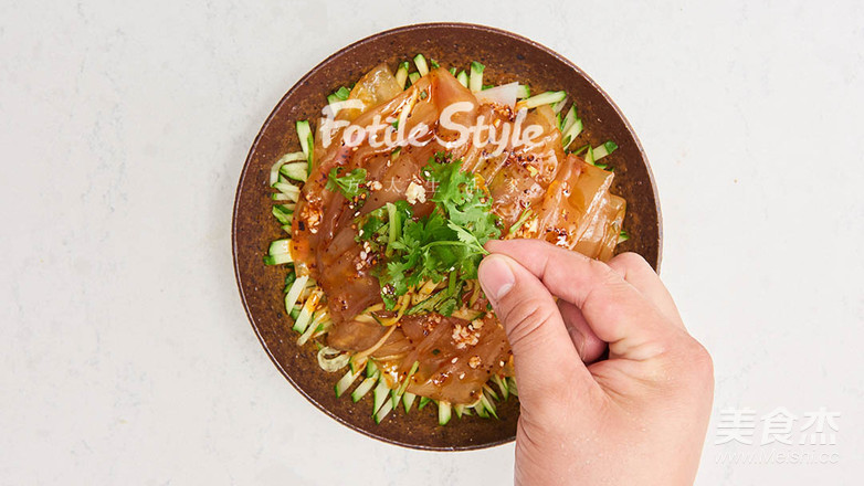 從冰箱拿出拉皮和黃瓜擺盤,澆上調(diào)料汁