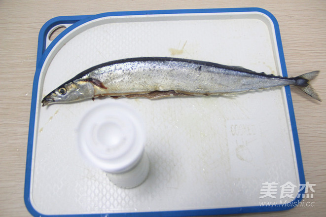 秋刀魚去除內臟魚腮,洗凈瀝干,;