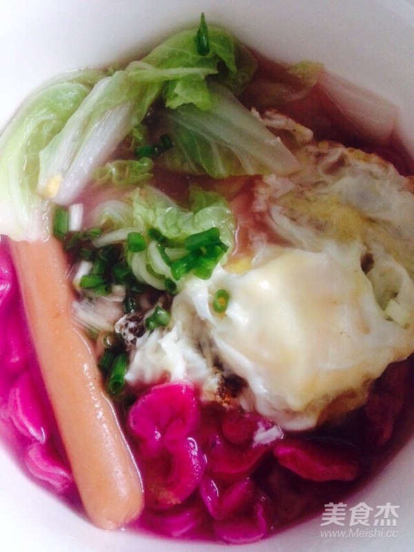 把蝴蝶面放入醬汁湯中,放入火腿腸,白菜和荷包蛋