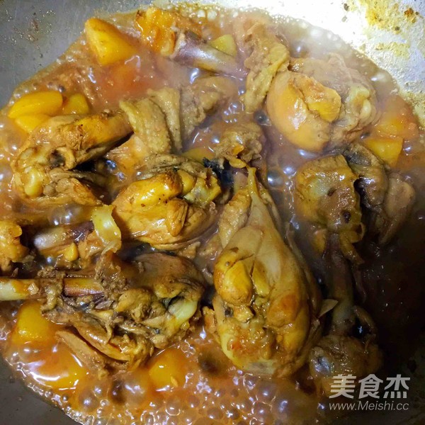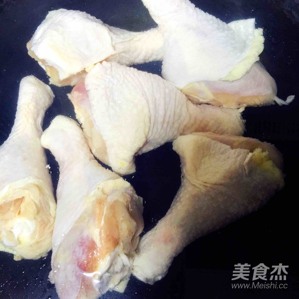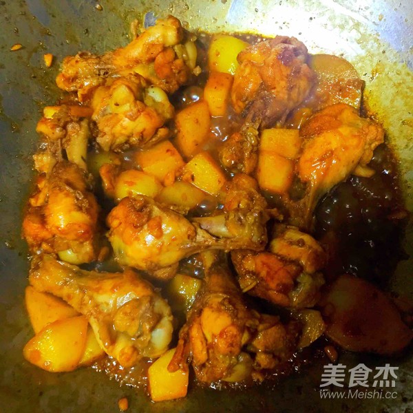 鍋里放一勺油,油開放蒜爆炒,放雞腿、土豆、鹽、糖、醬油,翻炒