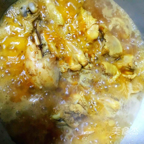 翻炒后大火加水,放姜、料酒,燉到湯快沒