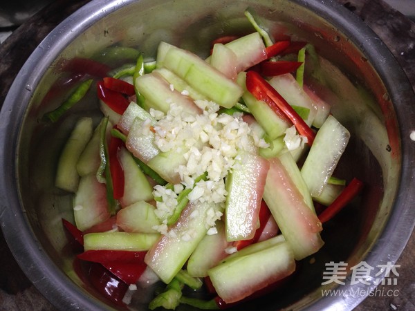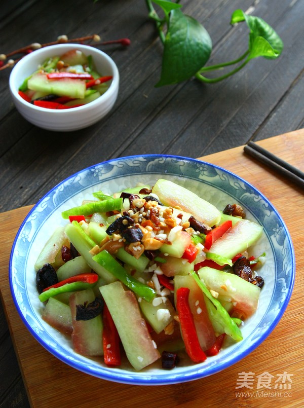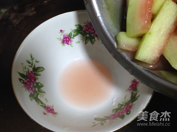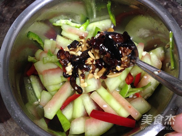 西瓜皮去掉外面的翠衣,刮去少許紅瓤