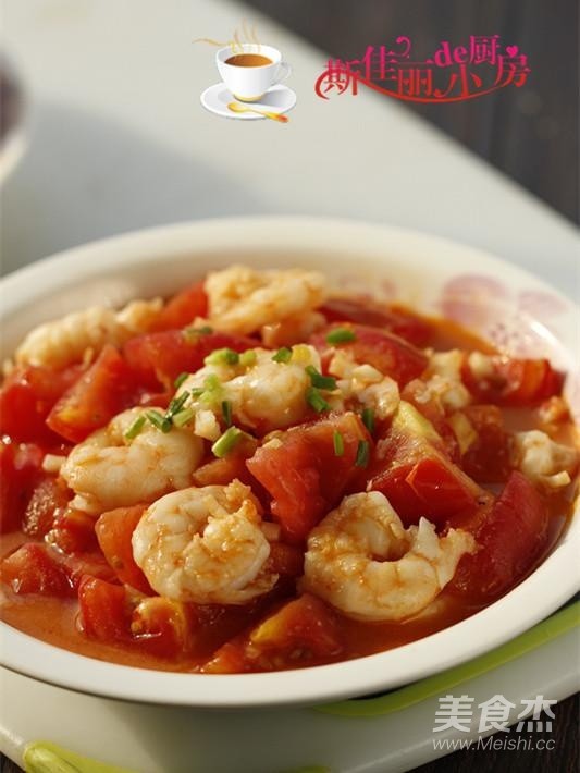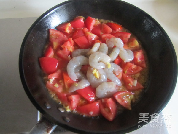 番茄塊微微炒出汁來后放入蝦仁進去翻炒;