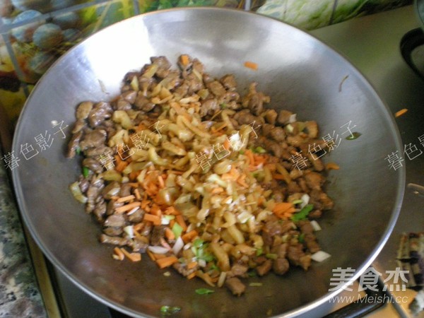 肉炒熟,在放菜一起炒,全部都混合好大概三分鐘出鍋