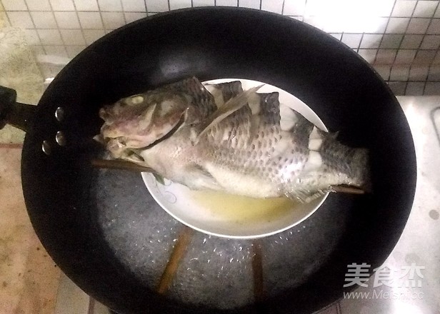 鯽魚(yú)洗凈,在兩面切幾刀加入適量鹽腌10分鐘,蔥和姜切絲