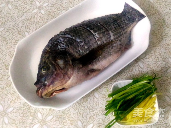 將蒸好的魚(yú)擺入盤中,擺入切好的姜絲和蔥絲