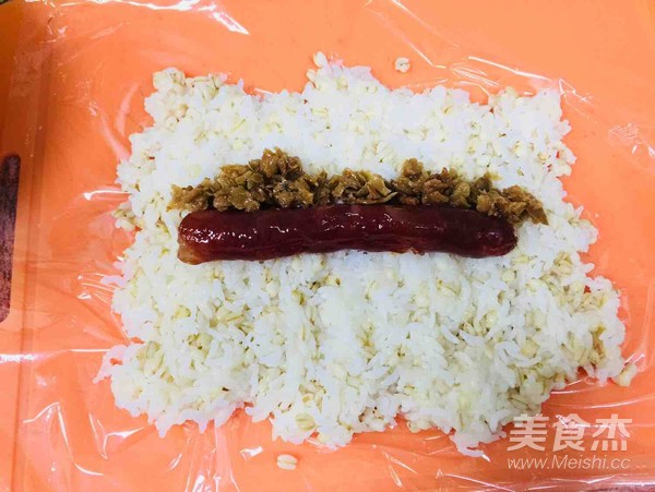 保鮮膜平鋪,飯根據香腸長短鋪好。
