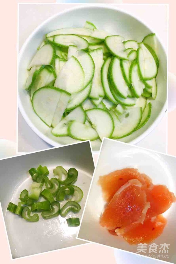 角瓜洗凈切片,肉切片,準備少許蔥花。