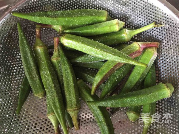 鍋里燒熱油少許,淋在秋葵上。
