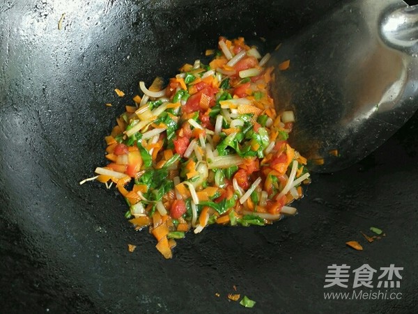 西紅柿放進去翻炒,放點醬油繼續(xù)炒,感覺干就少放點水,因為油放的少別糊了。