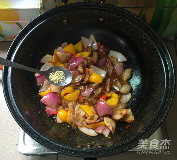 鍋中注入食用油,下小米椒,生姜煸炒。