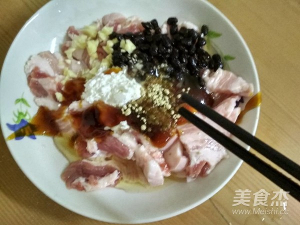 五花肉切成薄片,蒜白、豆豉切碎,加入適量花生油、1茶匙鹽、半茶匙白糖,生粉調味