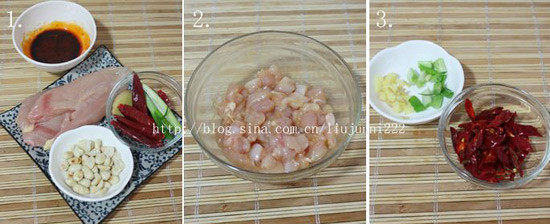 配料:油炸花生仁20克(去皮)、干辣椒8個、生姜5克、蔥5克